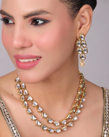 18K Gold Plated double layer Oval-Shape Kundan Necklace with Kundan Pearl Droplet Earrings