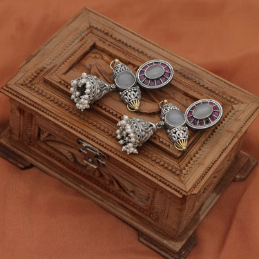 Oxidised Silver Rajwadi Rang Pink Stone Jhumka