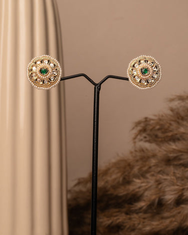 Elevate your accessory collection with these exquisite Kundan and pearl stud earrings, a perfect blend of traditional artistry and contemporary elegance. Each earring features an intricate gold-colored Kundan design, meticulously crafted to showcase a stunning circular pattern that radiates sophistication. These earrings not only capture the essence of timeless tradition but also exude a refined charm that makes them suitable for both special occasions and everyday wear. Whether you're dressing up for a wedding, a festive celebration, or simply looking to add a dash of glamour to your outfit, these Kundan and pearl earrings are sure to make a statement and become a cherished part of your jewelry collection.