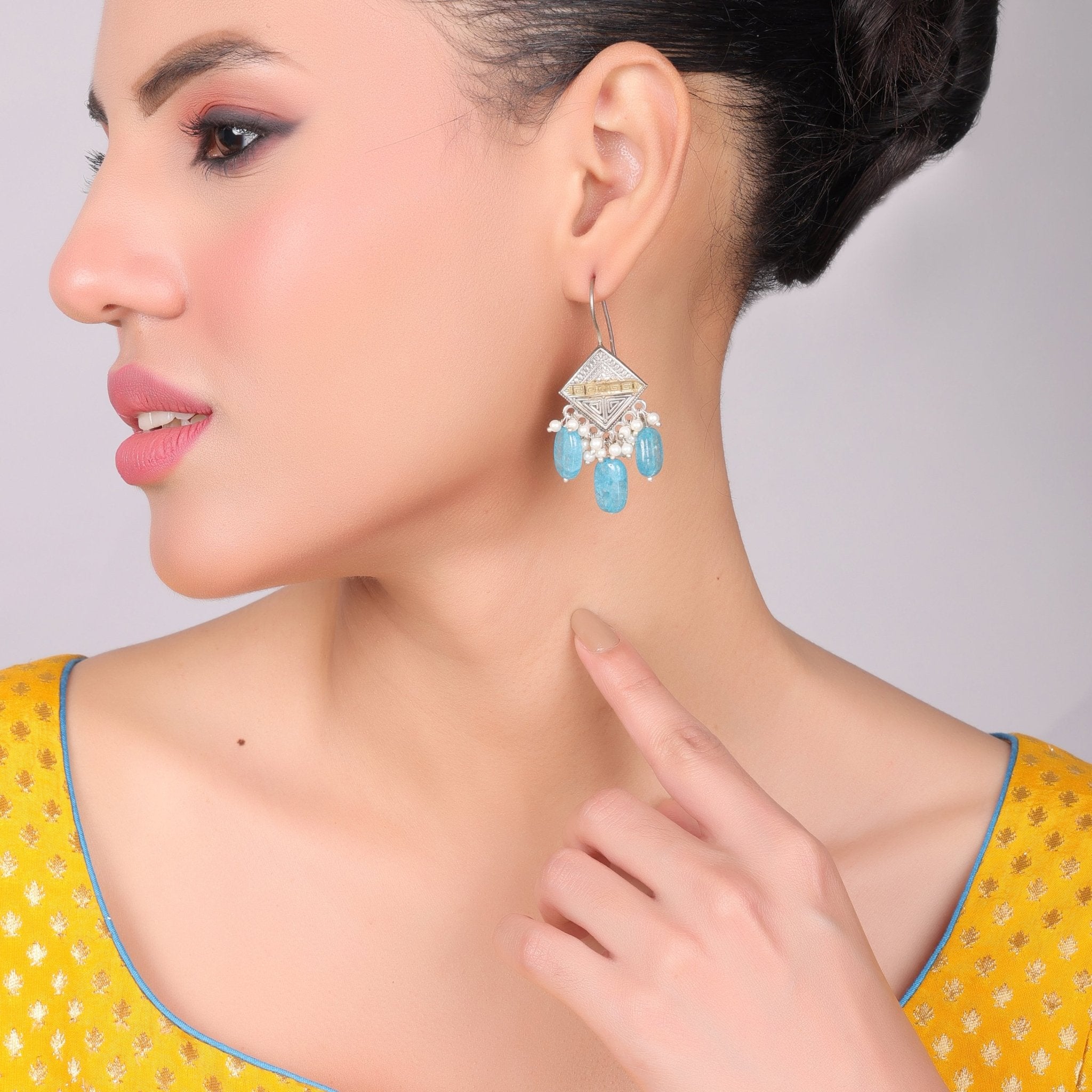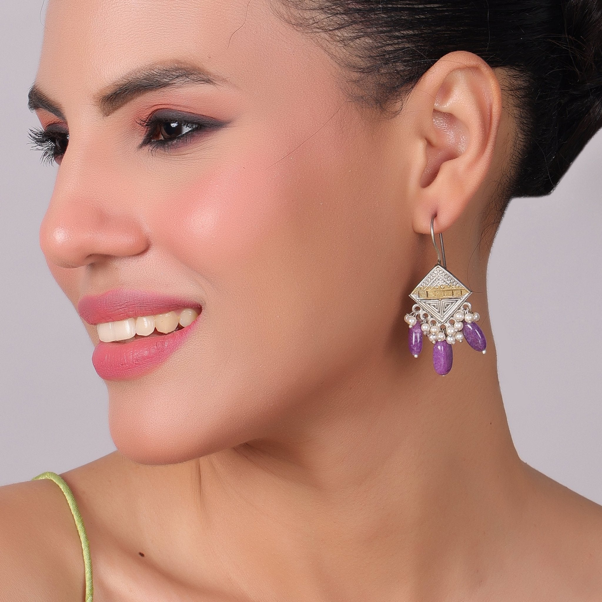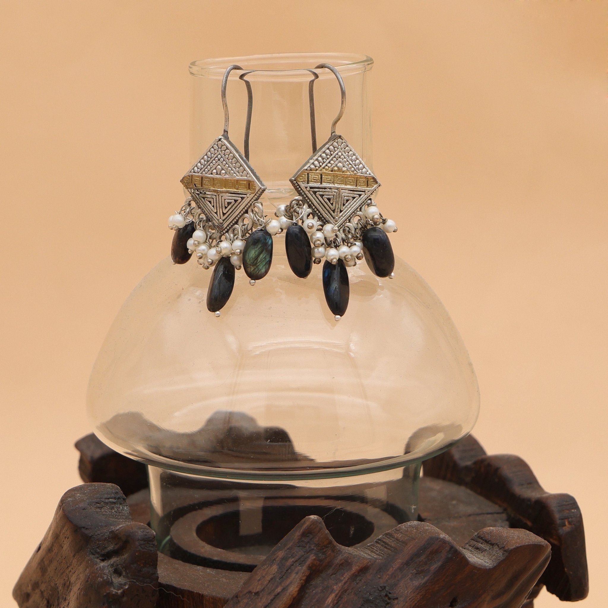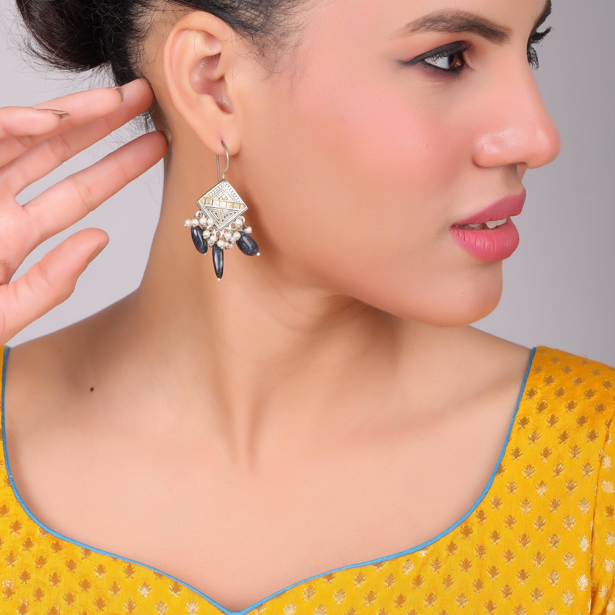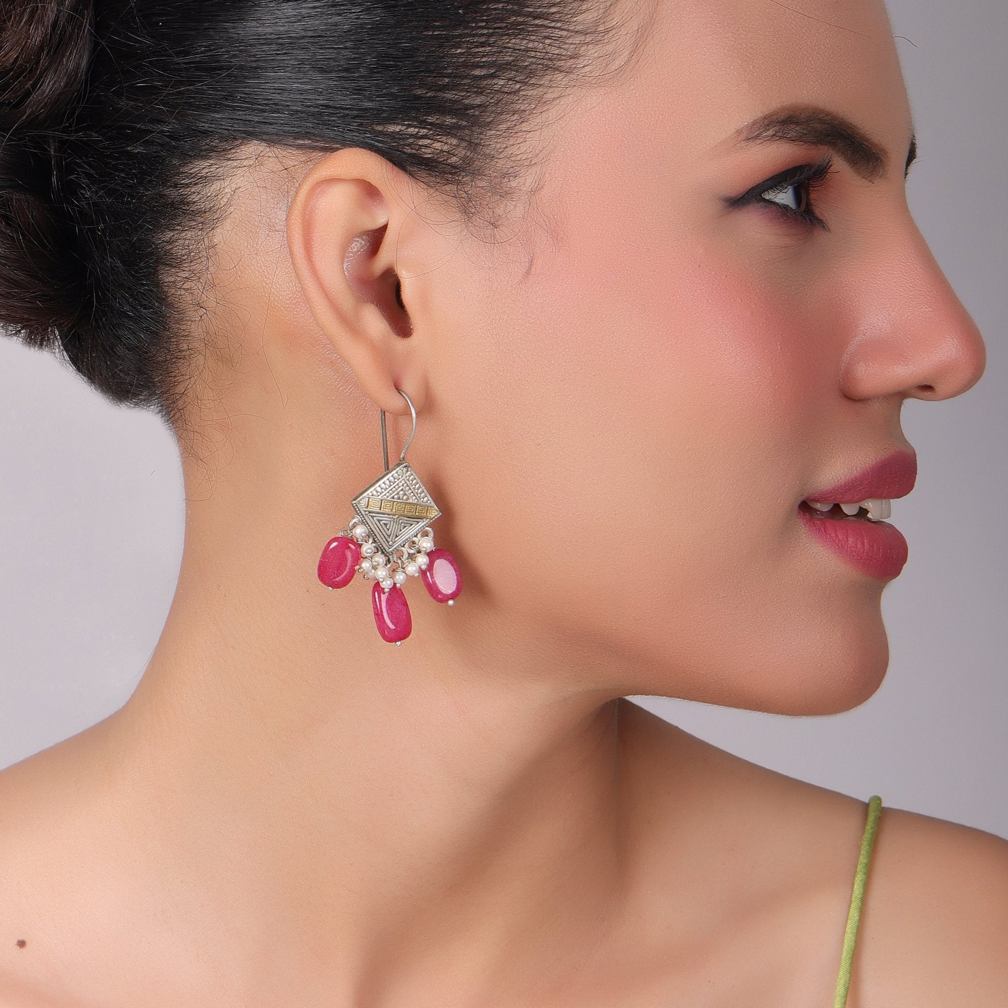 Silver Oxidised Red Gemstone and Pearl Drop Earrings